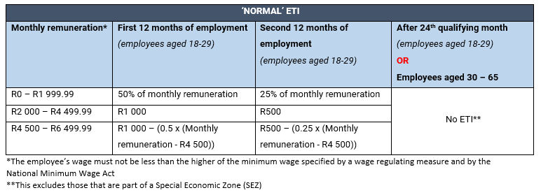 The following table details the amount that can be claimed for ETI per qualifying employee under regular circumstances: