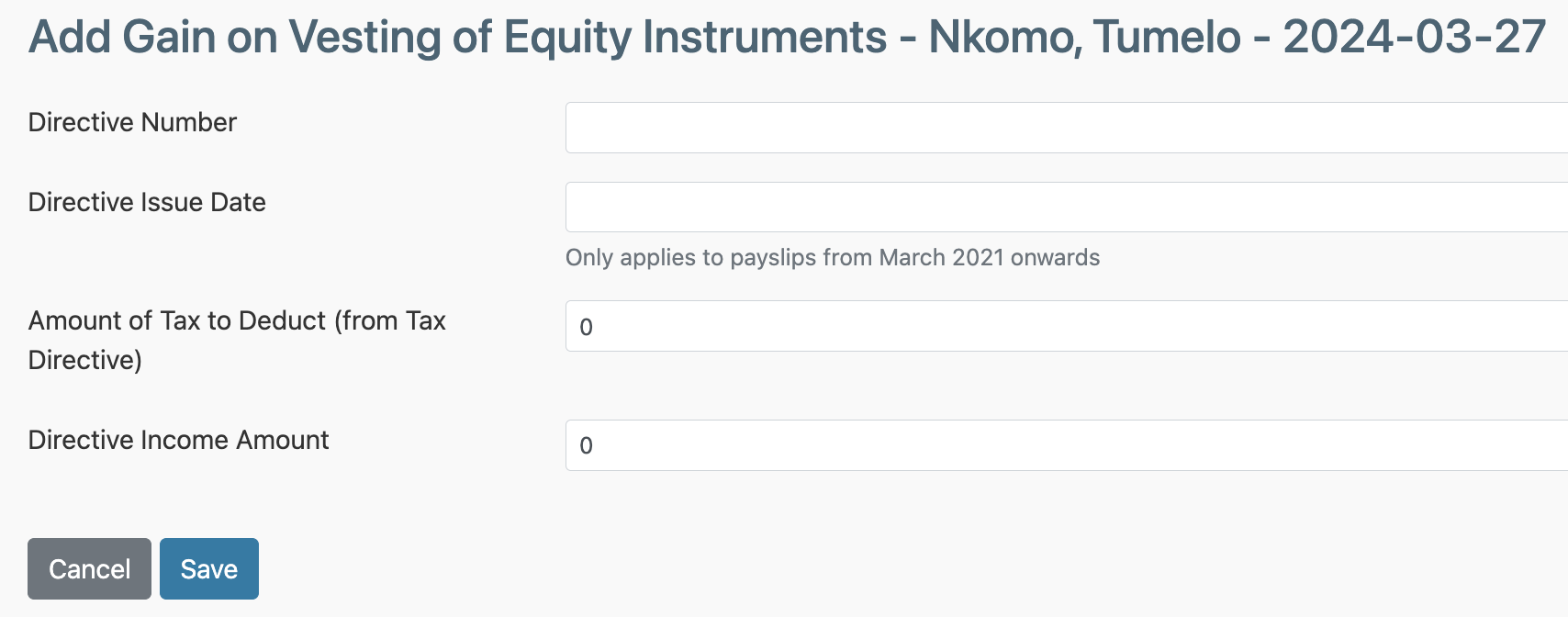 This is not advised as it is almost certain that the tax will be incorrectly calculated if the payment is recorded as normal or irregular income. Additionally, while both a custom allowance and the Gain on Vesting of Equity Instruments item report to allowance SARS codes, the tax directive still provides the rate at which PAYE must be deducted, while a custom allowance will be taxed according to the standard rate. This will result in an inaccurate declaration by the company of the individual’s PAYE, which would require correction upon assessment.