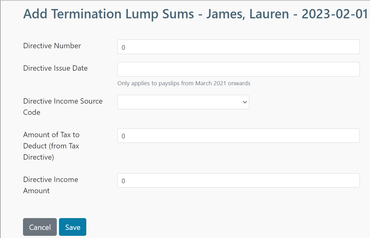 Please note: When adding a Termination Lump Sums item for additional leave encashment, ensure that you have selected “3907 – Other lump sum” as the Directive Income Source Code.
