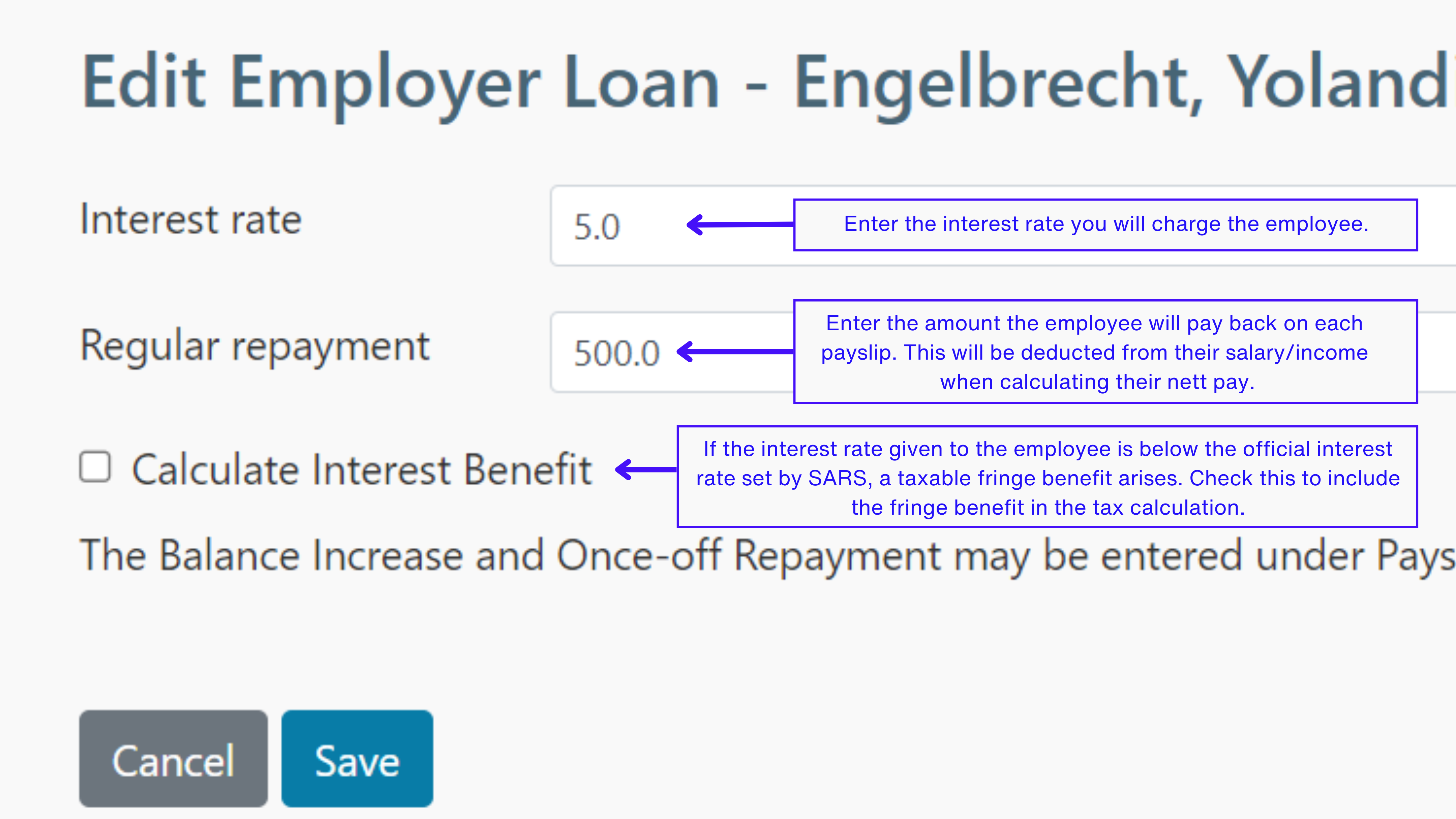 Click on Calculate Interest Benefit if the granting of the loan will give rise to a taxable benefit. Such a benefit will arise where an employer grants an employee a loan on which no interest, or interest at a rate lower than the official rate of interest, is charged. The value of the benefit is the difference between the amount of interest that would have been paid on the loan during the tax year at the official rate, and the amount of interest (if any) actually incurred by the employee.