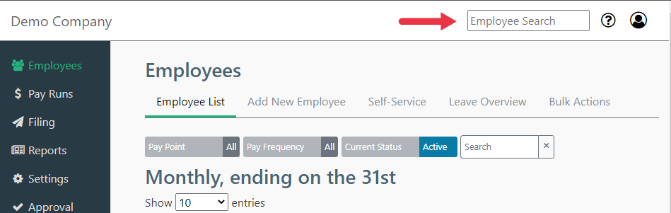 Our system allows you to easily search for and find employees by using their name, employee number, passport number or identification number (ID) in a search bar. This can be used to quickly find an employee in order to record leave, finalise a payslip and more.